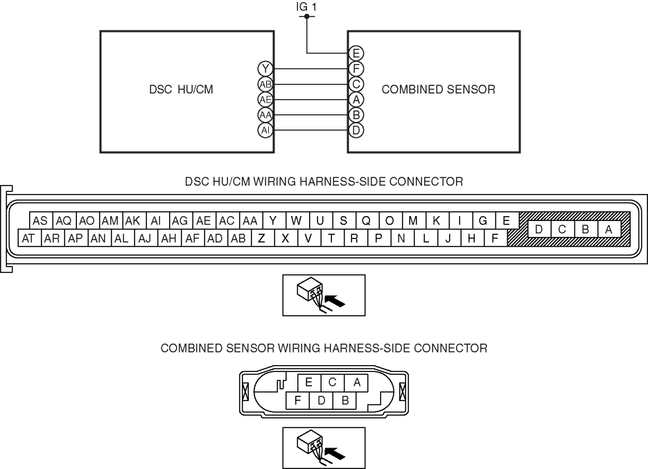 • Inspect for continuity between DSC HU/CM terminal AI (harness-side) and combined sensor terminal D (harness-side).